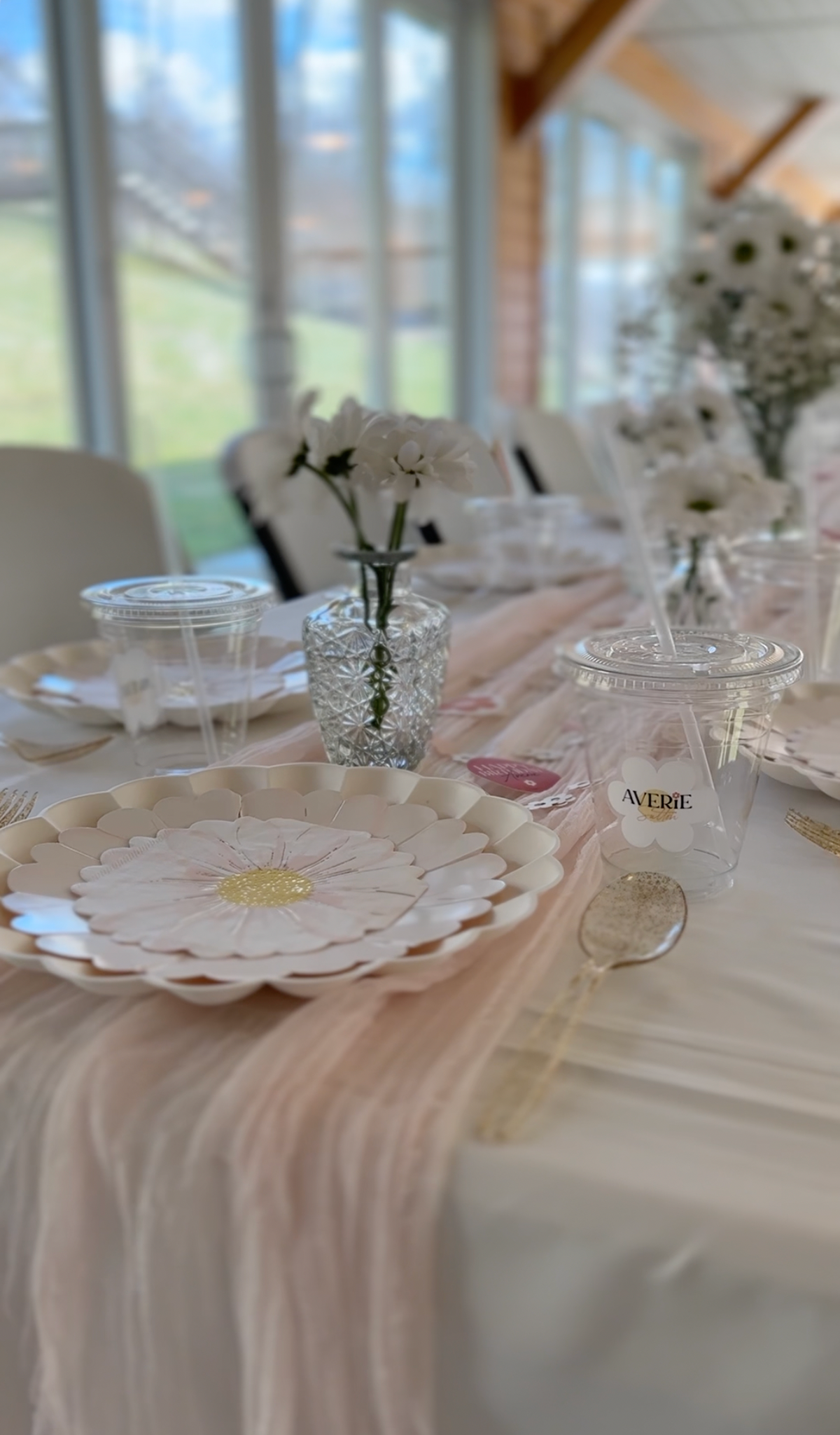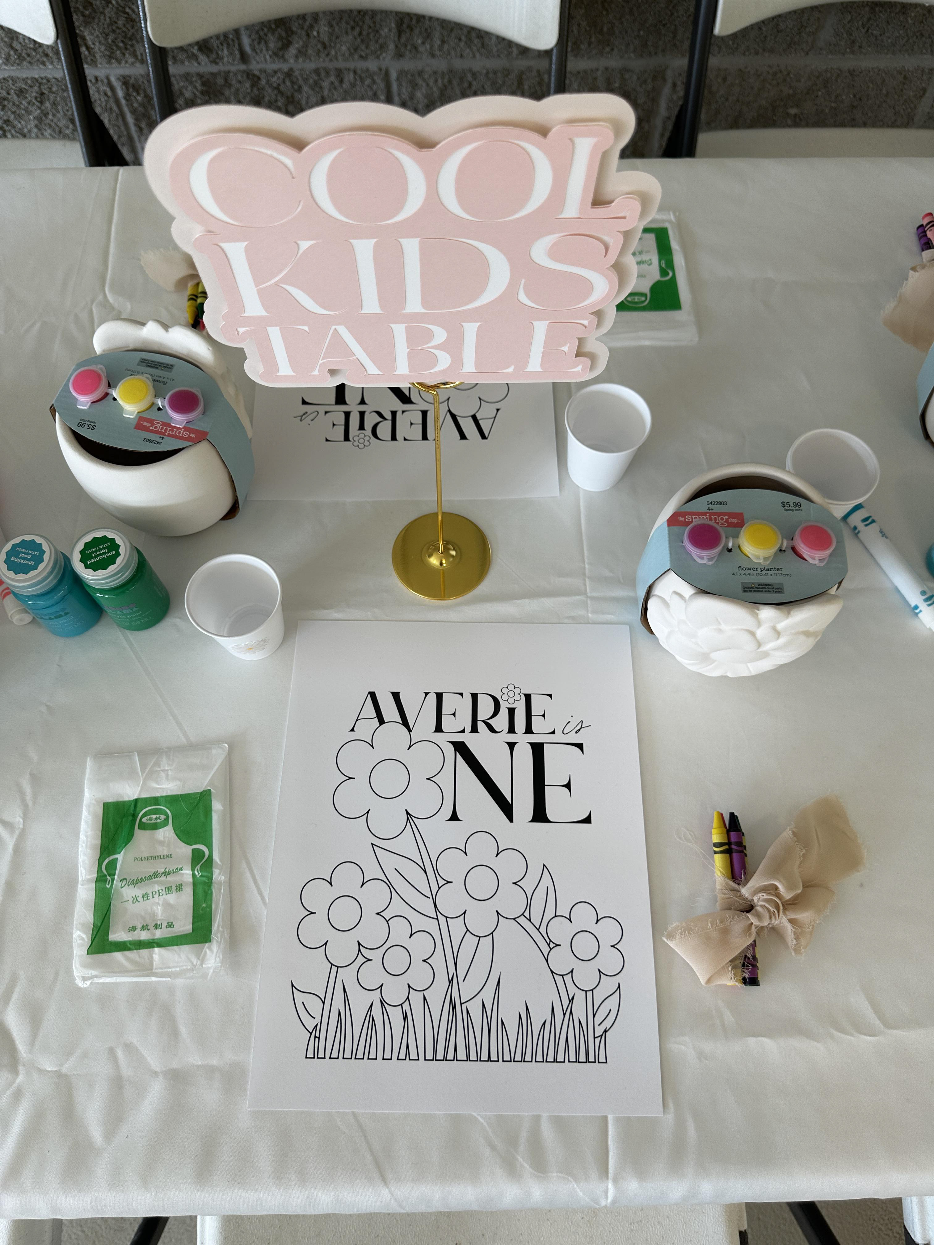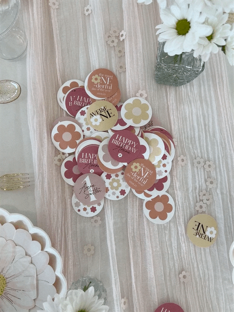 A first birthday party DREAM! This daisy theme was brought to life in every tiny detail. The client wanted to go all-out — and so we did. From the invitation to custom stickers, hand-cut daisy confetti, to custom cups and signage.